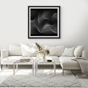 Plagát v čiernom ráme - Minimalistické vlny v čiernej a bielej farbe - 50x70cm - Tanec svetla v priestore - Moderná nástenná dekorácia do obývacej izby a spálne ARTTOR