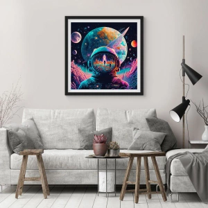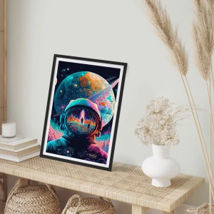 • Plagát zobrazuje astronauta na pozadí veľkolepej vesmírnej krajiny. Odraz v prilbe odhaľuje cudziu planétu plnú farebných tvarov a tajomnej atmosféry, čím vytvára jedinečnú futuristickú kompozíciu.