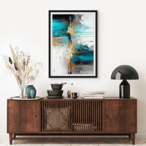 - Plagát zobrazuje abstraktnú kompozíciu v odtieňoch tyrkysovej, zlatej a bielej. Zlaté akcenty dodávajú eleganciu, zatiaľ čo dynamické línie vytvárajú výraznú štruktúru, ktorá sa dokonale hodí do moderných interiérov.
