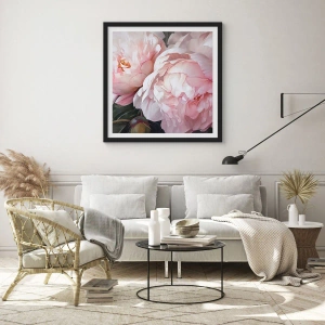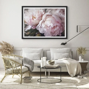 Plagát v čiernom ráme - Jemné pivonky v pastelových odtieňoch ružovej a bielej - 50x70cm - Uchytené v rozkvete - Moderná nástenná dekorácia do obývacej izby a spálne ARTTOR