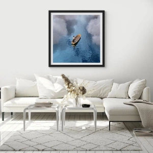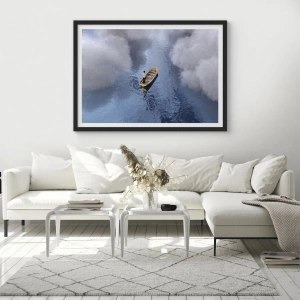 Plagát v čiernom ráme - Osoba v člne plávajúcej na vode odrážajúca oblohu a oblaky. - 50x70cm - Život – cesta – neistota - Moderná nástenná dekorácia do obývacej izby a spálne ARTTOR