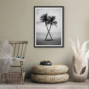 Tender Presence je plagát, ktorý zobrazuje dve palmy stojace na tropickej pláži. Obrázok zobrazuje jemnú, pokojnú krajinu, kde stromy rastú v jedinečnom usporiadaní a vytvárajú pocit rovnováhy. Čas sa zastaví v tomto okamihu pokoja, kde sa palmy a more stretávajú na pozadí idylickej oblohy. Obrázok evokuje pocit odpočinku a harmónie s prírodou a kombinuje ho s minimalistickým pozadím.