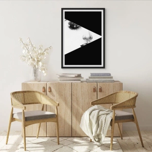 Plagát v čiernom ráme - Minimalistický portrét ženy v čiernej a bielej farbe s geometrickým členením. - 50x70cm - Vždy neobjavená - Moderná nástenná dekorácia do obývacej izby a spálne ARTTOR