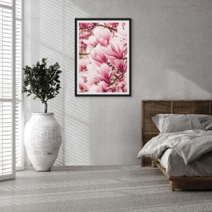 Plagát v čiernom ráme - Romanticky kvitnúce magnólie v jemnej ružovej farbe - 50x70cm - Jar je ružová - Moderná nástenná dekorácia do obývacej izby a spálne ARTTOR