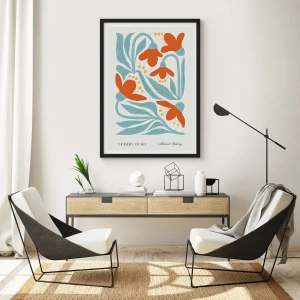 • Tento plagát zobrazuje dekoratívne kvety v odtieňoch oranžovej a modrej. Jeho minimalistický a geometrický štýl mu dodáva moderný vzhľad, ideálny pre elegantné interiéry inšpirované škandinávskym štýlom.