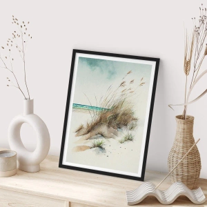 Plagát v čiernom ráme - Duny v štýle akvarelu s trávou pri pokojnom mori - 50x70cm - Zahalené v piesku - Moderná nástenná dekorácia do obývacej izby a spálne ARTTOR