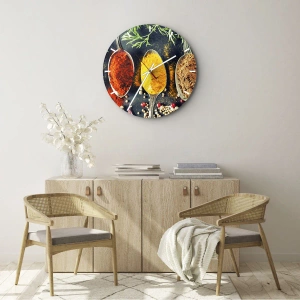 Nástenné hodiny „Kulinárske kúzlo“ sú esenciou kulinárskej vášne zachytenej vo forme funkčnej dekorácie. Ich ciferník obsahuje farebnú kompozíciu korenín a byliniek naaranžovaných na kovových lyžičkách – od intenzívne červenej papriky, cez zlatú kurkumu, aromatickú rascu až po zelenú petržlenovú vňať a čerstvé bylinky. Tento obraz pripomína kuchynskú linku plnú chutí a vôní, čím vytvára útulnú a inšpiratívnu atmosféru.