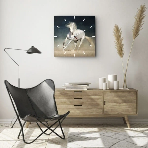 Nástenné hodiny - Biely kôň cválajúci cez piesk na pozadí tmavej oblohy. - 30x30cm - Sloboda v čistom stave - Moderná nástenná dekorácia do obývacej izby, kuchyne a spálne ARTTOR