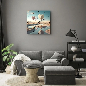 Nástenné hodiny - Balóny v tvare srdca plávajúce nad riekou - 30x30cm - Láska ťa nechá vzlietnuť - Moderná nástenná dekorácia do obývacej izby, kuchyne a spálne ARTTOR