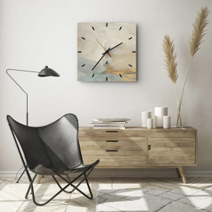 - Tieto hodiny sa vyznačujú jemným abstraktným dizajnom s jemnými ťahmi štetcom v odtieňoch béžovej, modrej a zlatej. Tento harmonický maliarsky motív je ideálny do pokojných a svetlých interiérov.