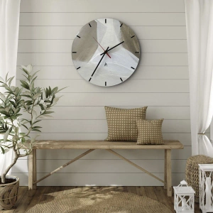 Nástenné hodiny „Vlna bielej“ sú návrhom pre milovníkov jemnej, minimalistickej estetiky. Kompozícia založená na jemných ťahoch bielej a béžovej farby na pozadí chladných odtieňov sivej evokuje pokoj, ticho a priestor. Abstraktná forma získava vďaka svojej jednoduchosti a harmónii jedinečný charakter.