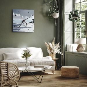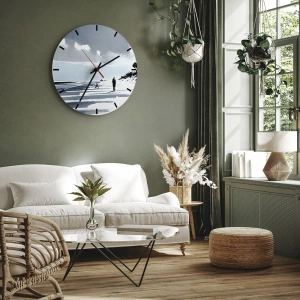 - Nástenné sklenené hodiny s rozmermi 30x30 cm zobrazujúce siluetu osamelej osoby prechádzajúcej sa po tichej pláži. Akvarelová kompozícia s atmosférickým a reflexívnym nádychom.