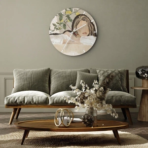 • Tieto nástenné hodiny zobrazujú ženu s dlhými vlasmi na pozadí citrónovníka. Kompozícia plná jemnosti a južanského nádychu. Ideálne do interiérov inšpirovaných prírodou a pokojom.