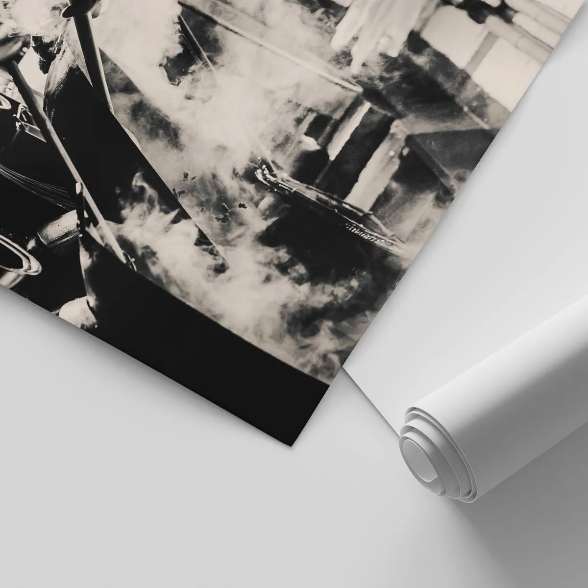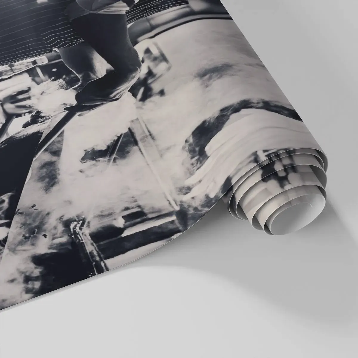 Fototapeta Alchýmia chutí zobrazuje neuveriteľne dynamickú scénu varenia v profesionálnej kuchyni. V čiernobielej kompozícii vidíme šéfkuchára, ako sa nakláňa nad panvicu, z ktorej stúpa intenzívna para a vytvára atmosféru sústredenia a vášne.