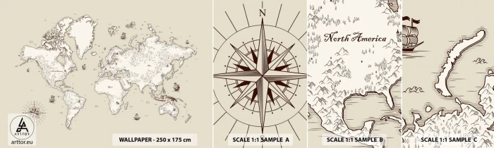 Vzorka Fototapeta Standard Eco - Cesta okolo sveta - Mapa sveta, kontinentov, Pirátska loď - 100x30 cm