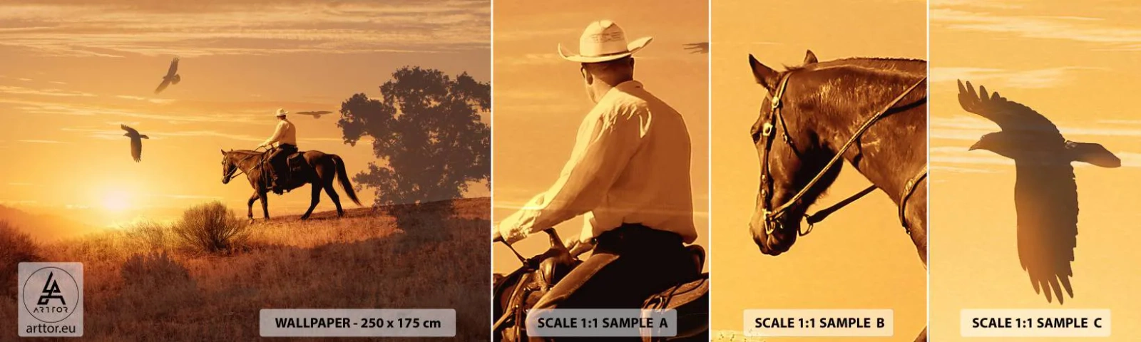 Vzorka Fototapeta Standard Eco - Sám cez prériu - Kôň, Kovboj, Krajina - 100x30 cm