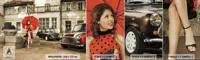 Vzorka fototapety Premium Sand - Sentimentálne mini cestovanie - Žena, Architektúra, Auto - 100x30 cm
