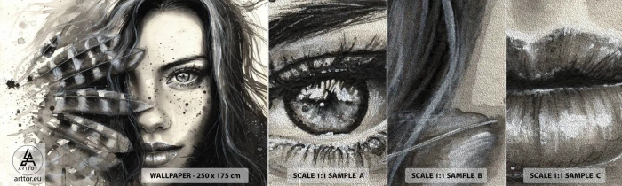 Vzorka fototapety Premium Sand - Divoká krása - Žena, Vtáčie perie, Grafika - 100x30 cm