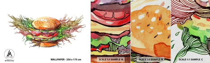 Vzorka fototapety Premium Sand - Horúce pokušenie - Gastronómia, Hamburger, Kulinárske - 100x30 cm