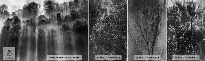 Vzorka fototapety Premium Sand - V lúčoch svetla - Krajina, les, Čierna a biela - 100x30 cm