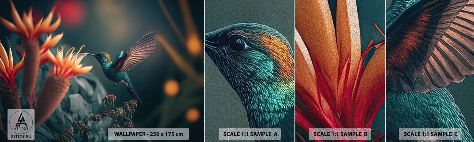 Vzorka fototapety Premium Sand - Skutočne pestrý život - Vták, Exotické, Kvetina - 100x30 cm