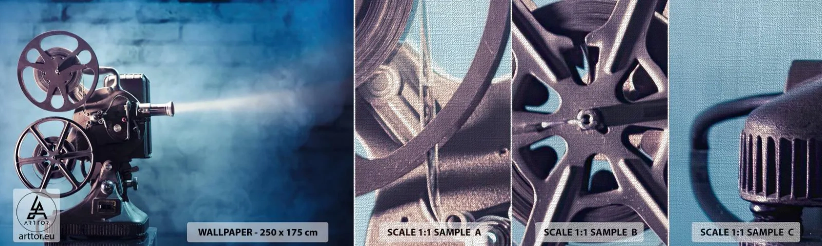 Vzorka fototapety Premium Canvas - V starom kine - Filmový projektor, Vintage, fotoaparát - 100x30 cm