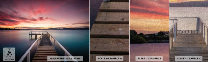 Vzorka fototapety Premium Canvas - Jemný plameň večera - Krajina, Západ slnka, Drevené mólo - 100x30 cm
