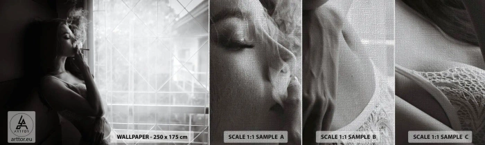 Vzorka fototapety Premium Canvas - Zmyselný okamih - Žena, Cigareta, Spálňa - 100x30 cm