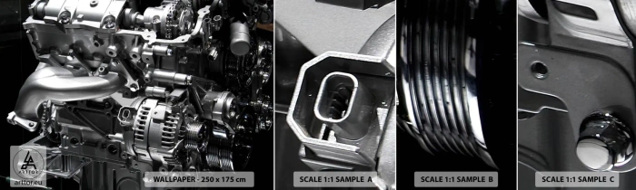 Vzorka samolepiacej fototapety Deluxe Sticker - Kovový, krásny, silný - Automobilový priemysel, Motor auta, 3D - 100x30 cm
