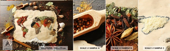 Vzorka samolepiacej fototapety Deluxe Sticker - Všetky chute sveta - Gastronómia, Mapa sveta, Sušené korenie - 100x30 cm