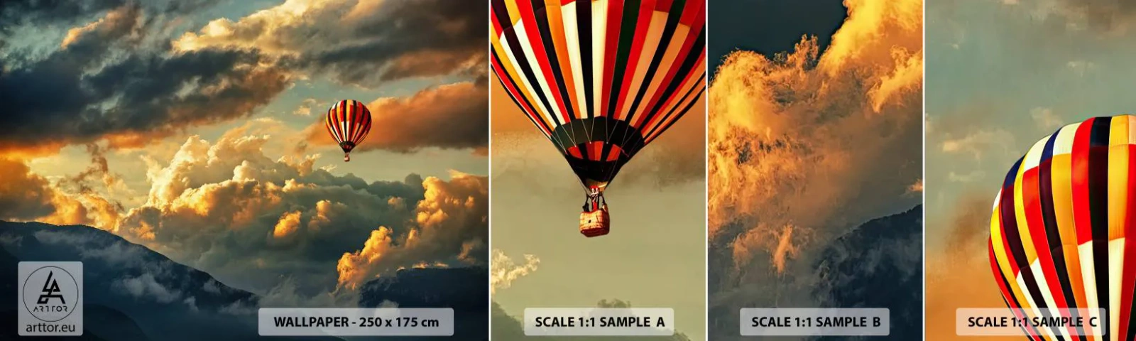 Vzorka samolepiacej fototapety Deluxe Sticker - Letím, lebo chcem - Abstrakcia, Let balónom, hory - 100x30 cm