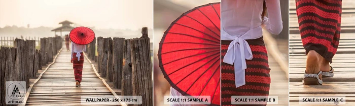 Vzorka samolepiacej fototapety Deluxe Sticker - Na starom moste - Dáždnik, Barma, Drevený most - 100x30 cm