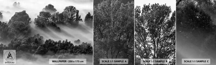 Vzorka samolepiacej fototapety Deluxe Sticker - Prebúdzanie zo spánku - Krajina, les, Hmla - 100x30 cm