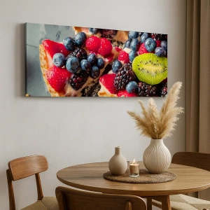 - Tento obraz zobrazuje farebný koláč s ovocím a smotanou. Je to perfektná voľba pre milovníkov kulinárskych a sladkých bytových dekorácií, ktoré vytvárajú lahodnú atmosféru.