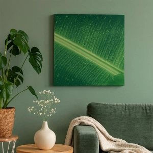 Zelená štruktúra je obraz, ktorý zobrazuje krásu prírody v jej najčistejšej podobe. Zelený list pokrytý kvapkami vody priťahuje pozornosť svojimi detailmi a prírodným šarmom. Tento tropický motív dokonale zachytáva sviežosť a harmóniu prírody a prináša tieto prvky do interiérov.
