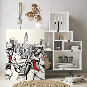 - Umelecká scéna zobrazujúca dvoch jazzových hudobníkov hrajúcich na pozadí panorámy mesta. Dokonalá dekorácia pre milovníkov hudby a umenia.