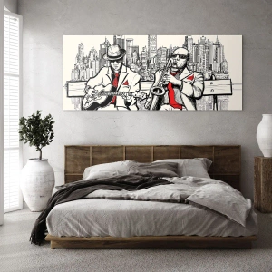 Obraz na skle - Dvaja džezoví hudobníci hrajúci na pozadí panorámy mesta - 70x50cm - Newyorská improvizácia - Moderná nástenná dekorácia do obývacej izby a spálne ARTTOR
