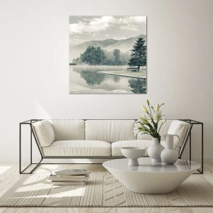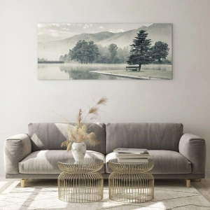 Jazero stále spí a hmlou pokrytá voda odráža oblohu a okolité stromy. Obraz zobrazuje tiché ráno pri jazere s lavičkou v strede, ktorá dodáva scéne pocit intimity a ticha. Čiernobiele tóny dokonale zachytávajú pokoj prírody a melancholickú atmosféru skorého rána. Je to harmonický obraz, ktorý do interiéru vnáša jedinečnú atmosféru pokoja.
