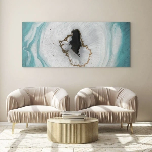 - Obraz zobrazuje abstraktnú kompozíciu inšpirovanú prirodzeným prierezom geódy s intenzívnymi tyrkysovými, bielymi a zlatými detailmi. Jeho moderný tvar a výrazný vzor sú pútavé a dodávajú eleganciu každému interiéru.
