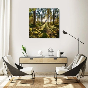Nástenné hodiny - Slnečné svetlo presvitá cez vysoké stromy v lese - 30x30cm - …Za siedmimi lesmi - Moderná nástenná dekorácia do obývacej izby, kuchyne a spálne ARTTOR