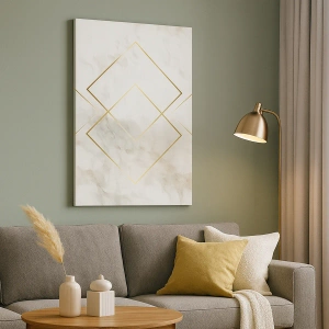 - Plátno s minimalistickými zlatými kosoštvorcami na bielom mramorovom podklade. Elegantný dekoratívny doplnok v modernom štýle, ktorý vnesie luxus a harmóniu do každého interiéru.