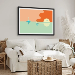 Plagát v čiernom ráme - Minimalistický západ slnka s plachetnicou v pozadí - 50x70cm - Dokonalá morská krajina - Moderná nástenná dekorácia do obývacej izby a spálne ARTTOR