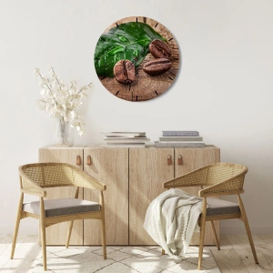 "{title_coffee_leaf}" sú štýlové nástenné hodiny, ktoré kombinujú krásu prírody s estetikou rustikálneho štýlu. Motív zobrazuje kávové zrná spolu so zeleným listom, aranžované na drevenom povrchu. Táto harmonická kompozícia zdôrazňuje prírodnú krásu a aromatickú symboliku kávy a vytvára perfektný doplnok do kuchyne, kaviarne alebo iného útulného interiéru.