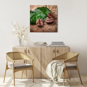 Motív kávových zŕn a zelených listov je odkazom na prírodné vzory a harmóniu, prináša do interiéru pokoj a eleganciu. Hodí sa do moderných aj rustikálnych priestorov a dodáva jedinečný šarm a výraz.