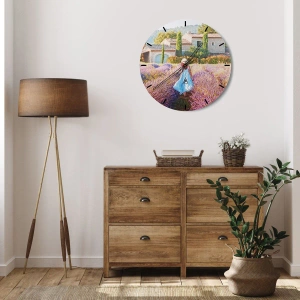 - Tieto nástenné hodiny zobrazujú malebný pohľad na ženu v modrých šatách, ktorá sa prechádza levanduľovým poľom. V pozadí stojí pôvabný kamenný dom v provensálskom štýle. Sú perfektnou dekoráciou pre milovníkov prírody a romantických krajín.