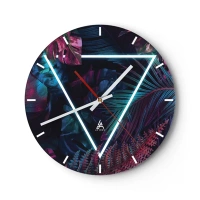 Nástenné hodiny - Tropické listy a papradie s neónovým trojuholníkom - 30x30cm - Záhrada v disco štýle - Moderná nástenná dekorácia do obývacej izby, kuchyne a spálne ARTTOR