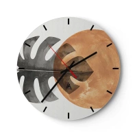 Nástenné hodiny - List monstery na pozadí veľkého oranžového kruhu ako slnko - 30x30cm - Vždy slnko - Moderná nástenná dekorácia do obývacej izby, kuchyne a spálne ARTTOR
