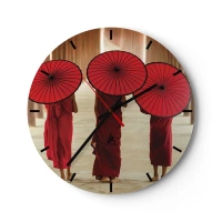 Nástenné hodiny - Traja mnísi v červených rúchach s dáždnikmi - 30x30cm - Na ceste do Čistej ríše - Moderná nástenná dekorácia do obývacej izby, kuchyne a spálne ARTTOR
