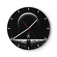 Nástenné hodiny - Silueta astronauta pred veľkou planétou vo vesmíre - 30x30cm - Tvári v tvár - Moderná nástenná dekorácia do obývacej izby, kuchyne a spálne ARTTOR