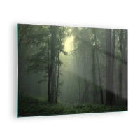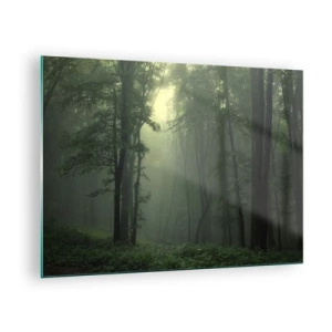 Obraz na skle - Tmavý les zahalený v hmle s lúčmi svetla - 70x50cm - Než sa prebudí - Moderná nástenná dekorácia do obývacej izby a spálne ARTTOR